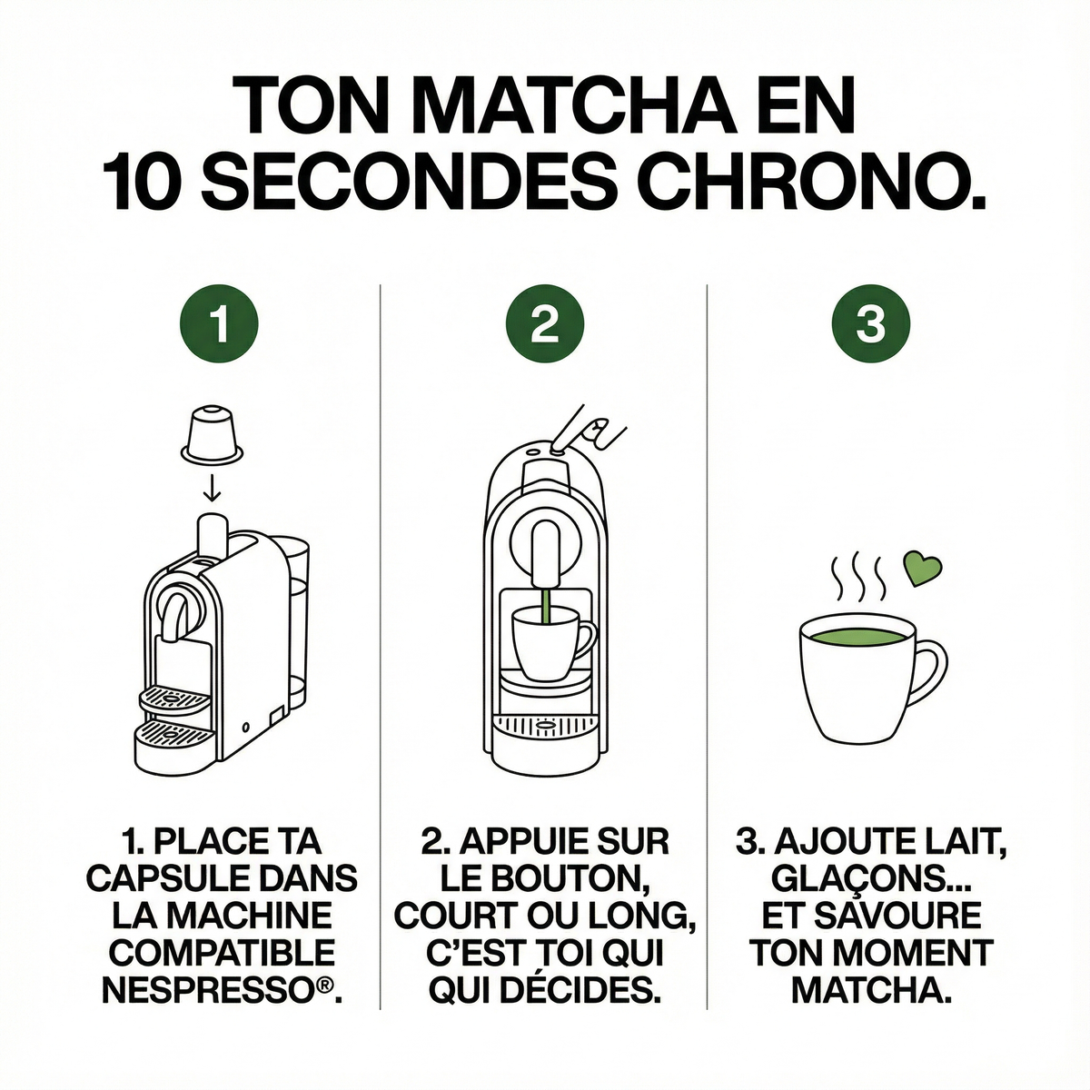 Le meilleur du matcha cérémonial, sans le chaos. 6 heures de concentration calme, zéro crash, zéro tremblement. Une capsule, une machine, 30 secondes.